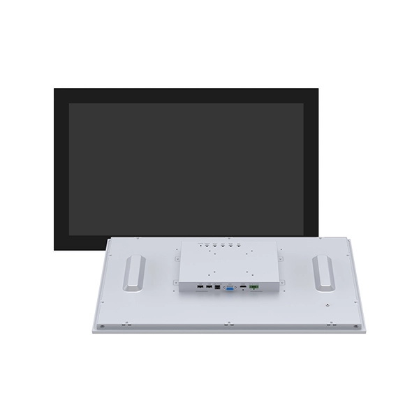 23.8” industrial-grade Full HD capacitive touch monitor with HDMI/VGA input, USB interface, wide voltage support, and aluminum front panel for control panels and machine interfaces