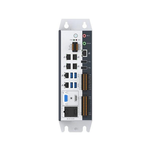 The NP-6120-EX01 Automation PC is a DIN-rail or wall-mount industrial computer designed for control cabinet installations. Powered by Intel® Core™ 6th–8th Gen processors, it integrates 7 GbE LAN ports, 2×RS232, 4×RS485, and 8 DI/8 DO for versatile connectivity.