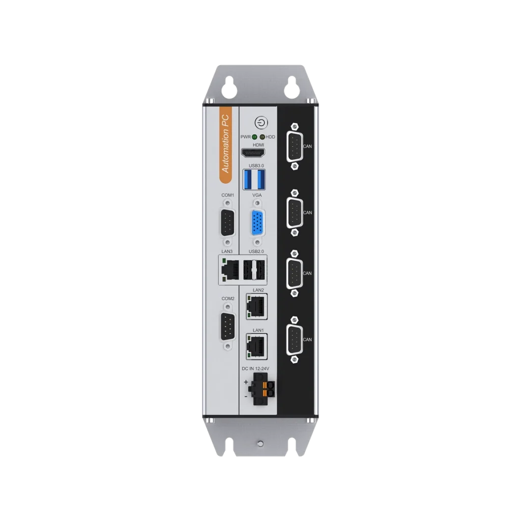 Fanless Automation PC with Intel® J6412/N97/Core™ i3-N305, 2 x PoE LAN, 1 x GbE, 1 x RS232/485, 1 x RS232, 4 x CAN2.0 A/B, mSATA, dual Mini PCIe, VGA/HDMI, and wall-mount or DIN-rail installation.
