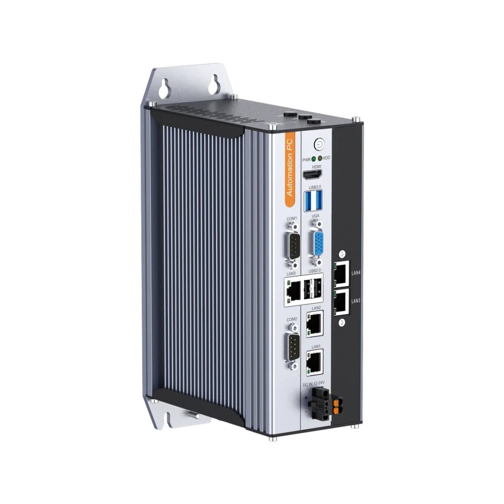 Fanless Automation PC with Intel® J6412/N97/Core™ i3-N305, 2 x PoE LAN, 1 x GbE, 2 x extended GbE, 1 x RS232/485, 1 x RS232, 4 x USB, 8 x DI, 8 x DO, mSATA, dual Mini PCIe, VGA/HDMI, and wall-mount or DIN-rail installation.