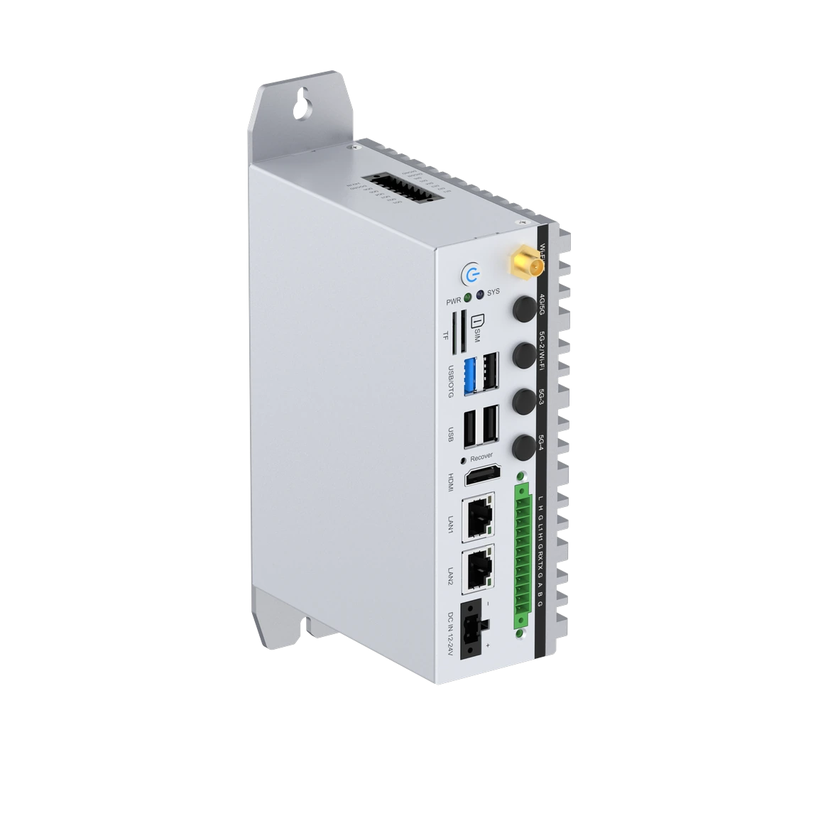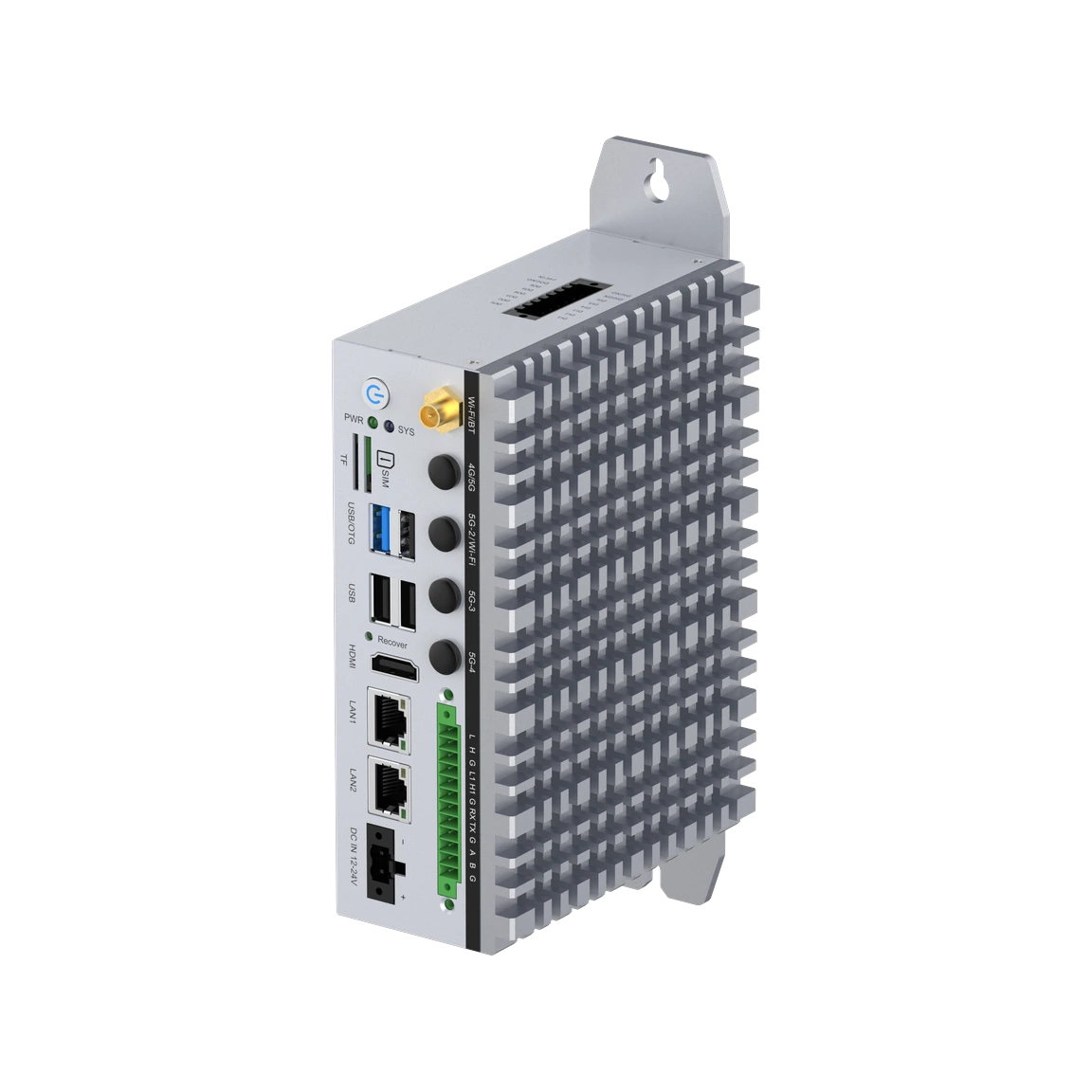 Fanless Rockchip RK3568/RK3576/RK3588 industrial gateway with 2×GbE, 1×RS232, 1×RS485, 2×CAN, optional 6×DI and 6×DO, HDMI, Wi-Fi, optional 4G/5G, and wall-mount or DIN-rail installation.