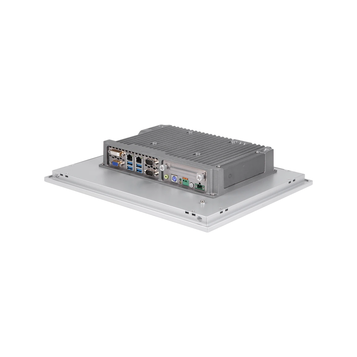 Rugged fanless Panel PC with Intel® J1900/J6412/N97/N305, dual GbE, 2×COM, 4×USB, VGA/DVI, DC12–24V input, and IP65 front; supports panel and VESA mounting.