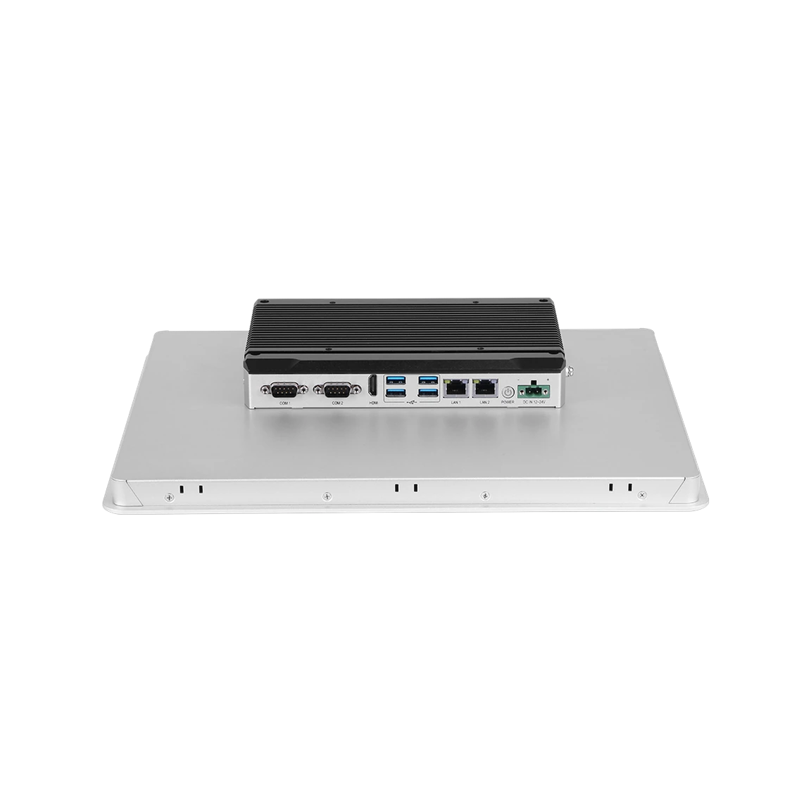 15″ fanless industrial panel PC with capacitive touchscreen, Intel Celeron J3455/J1900, Core i5, dual LAN & multiple COM ports, and flexible mounting options