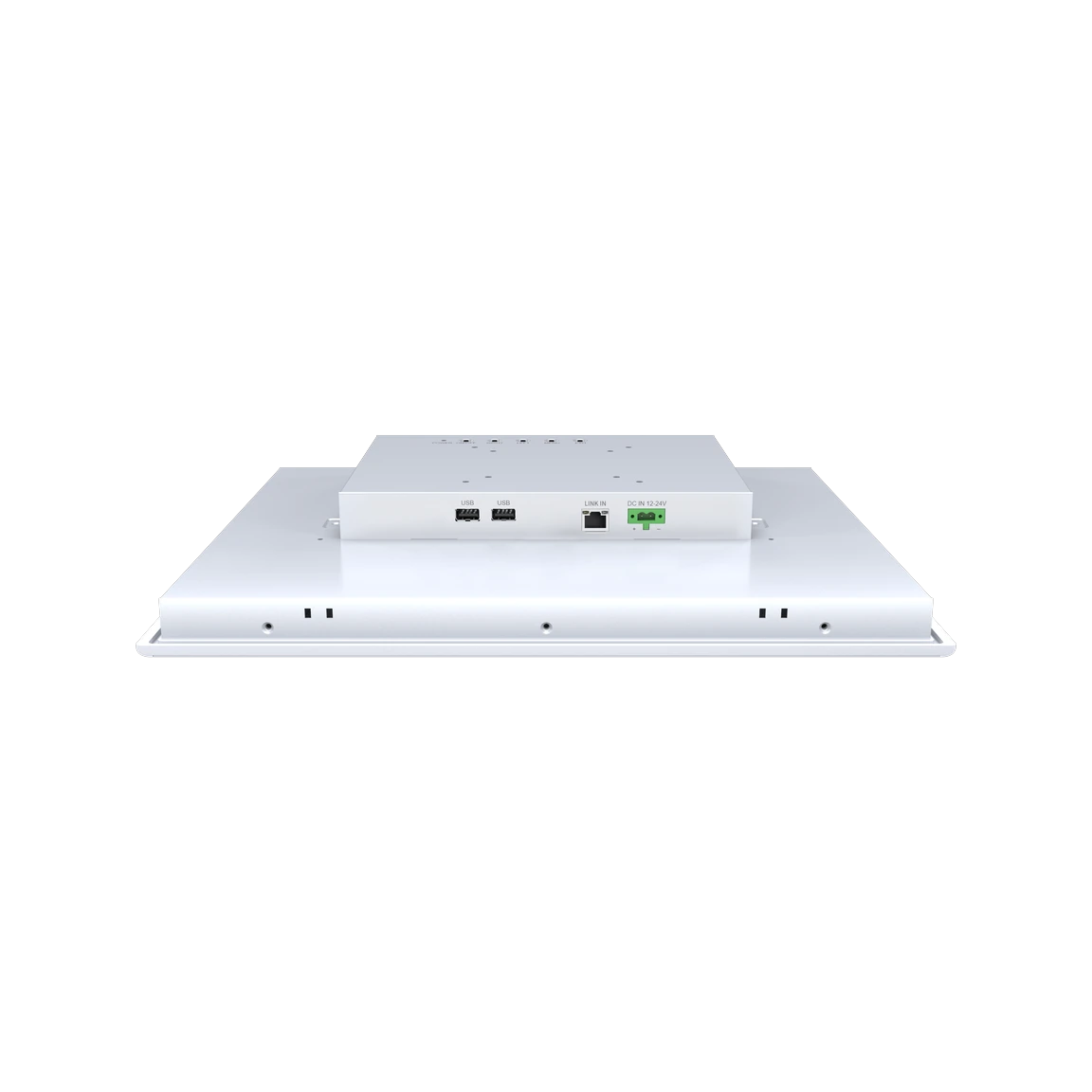 15″ resistive touch industrial monitor with 1024 × 768 display, RJ45 NDLink HDBaseT remote display input, 2 × USB 2.0 output, embedded installation, aluminum housing, and DC 12~24V input.