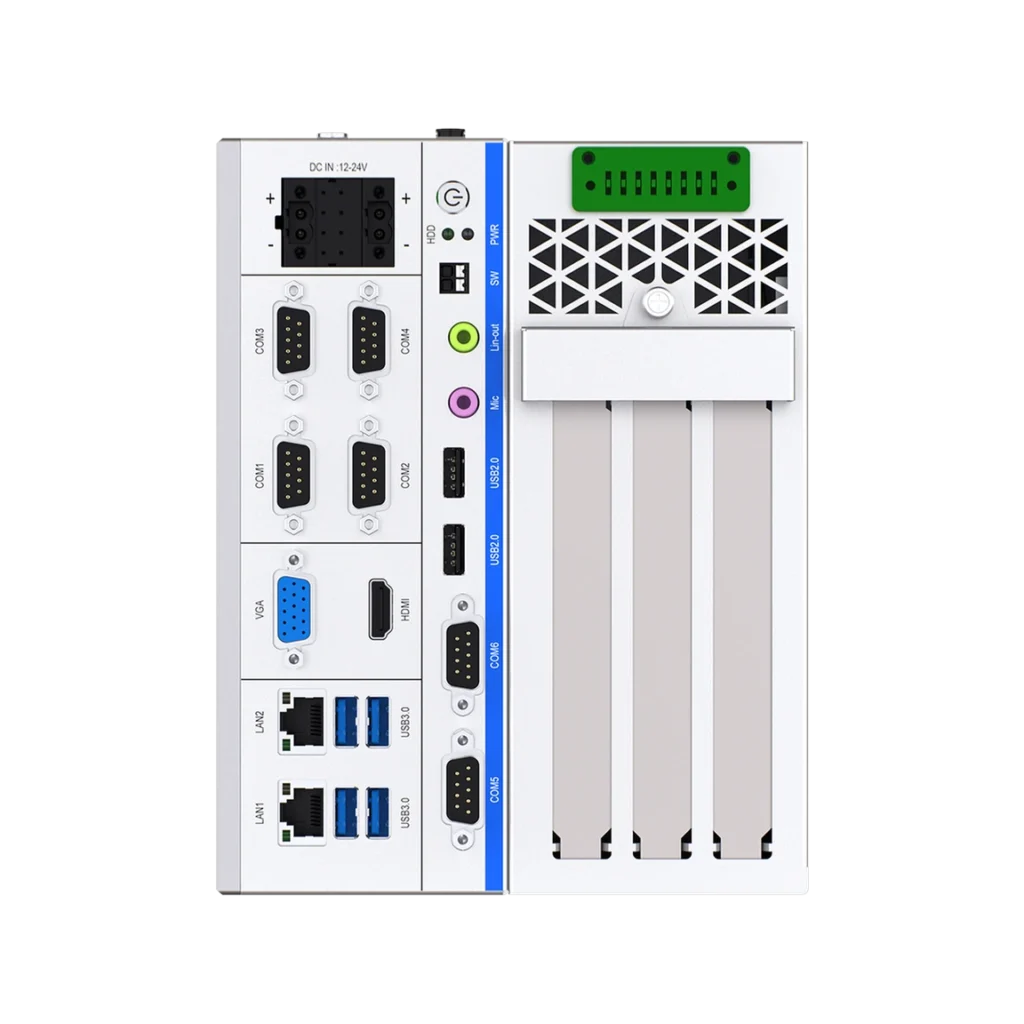 Fanless aluminum-magnesium box PC supporting Intel Core CPUs with 6 COM ports, PCI/PCIe expansion slots, dual LAN, and 4G/WiFi via mini-PCIe