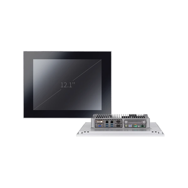 12.1″ XGA fanless industrial panel PC with resistive touch and bezel-free front design, powered by Intel J1900, J6412, N97, or N305 processors. Offers 2 GbE, 2 COM, 4 USB, DVI, wide voltage input (12–24V), and IP65-rated front panel.
