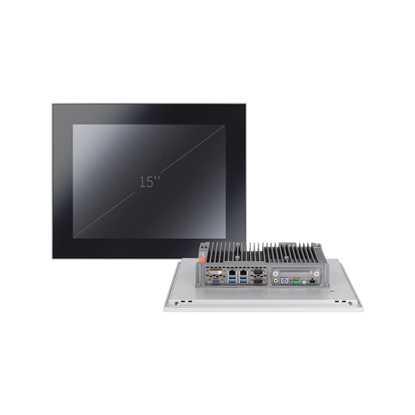 15″ fanless industrial Panel PC with bezel-free resistive touchscreen, supporting Intel J1900, J6412, N97, or N305 CPU. Designed for harsh environments with 2 × COM, 2 × GbE LAN, 4 × USB ports, and rugged IP65-rated front panel. Ideal for HMI and control applications.